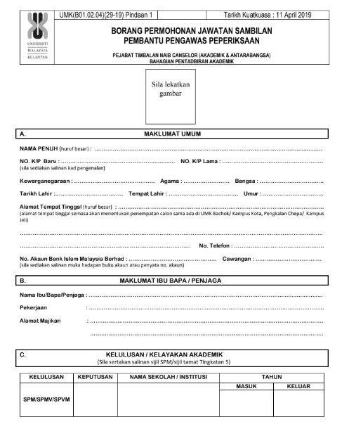 Iklan Jawatan Universiti Malaysia Kelantan (UMK) IKLAN JAWATAN Like serta Ikut Facebook Kami, follow Chanel WhatsApp Jawatan Kosong & Telegram Portal SPA9 untuk capaian pantas kekosongan jawatan daripada kami sekarang. BORANG PERMOHONAN