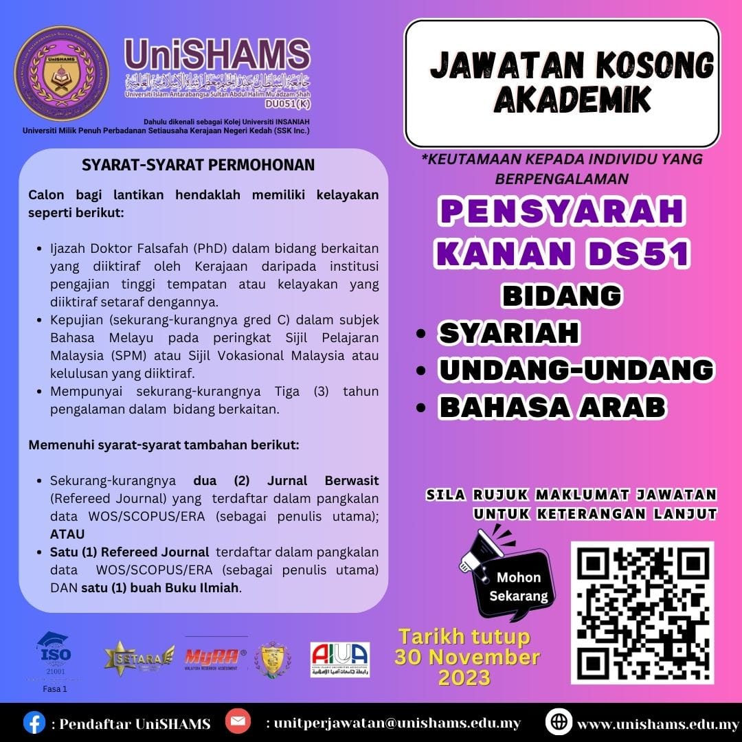 Iklan Jawatan UniSHAMS Like serta Ikut Facebook Kami, follow Chanel WhatsApp Jawatan Kosong & Telegram Portal SPA9 untuk capaian pantas kekosongan jawatan daripada kami sekarang. Klik Jawatan Disini