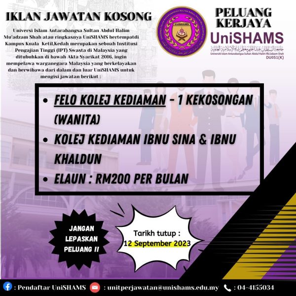 Iklan Jawatan Universiti Islam Antarabangsa Sultan Abdul Halim Mu’adzam Shah (UniSHAMS)