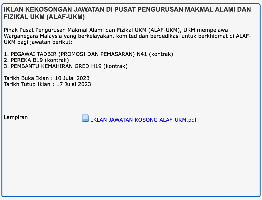 Iklan Jawatan Universiti Kebangsaan Malaysia (UKM) Like serta Ikut Facebook Kami, follow Chanel WhatsApp Jawatan Kosong & Telegram Portal SPA9 untuk capaian pantas kekosongan jawatan daripada kami sekarang. Klik Iklan Jawatan