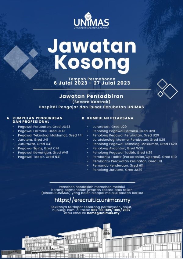 Iklan Jawatan Universiti Malaysia Sarawak (UNIMAS) Like serta Ikut Facebook Kami, follow Chanel WhatsApp Jawatan Kosong & Telegram Portal SPA9 untuk capaian pantas kekosongan jawatan daripada kami sekarang. Klik Jawatan Disini