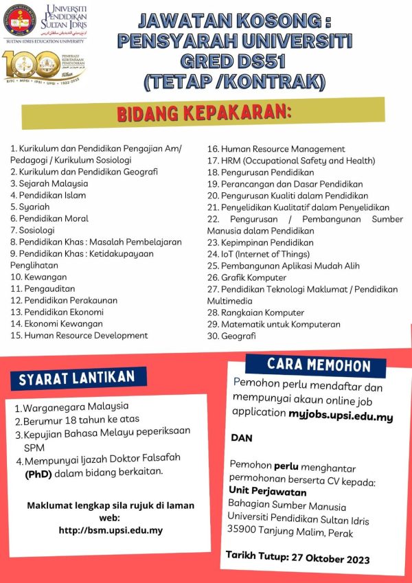 Iklan Jawatan Universiti Pendidikan Sultan Idris (UPSI) Like serta Ikut Facebook Kami, follow Chanel WhatsApp Jawatan Kosong & Telegram Portal SPA9 untuk capaian pantas kekosongan jawatan daripada kami sekarang. Klik Jawatan Disini