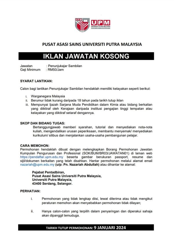 Iklan Jawatan Universiti Putra Malaysia (UPM) ~ Penunjukajar Sambilan Like serta Ikut Facebook Kami, follow Chanel WhatsApp Jawatan Kosong & Telegram Portal SPA9 untuk capaian pantas kekosongan jawatan daripada kami sekarang.