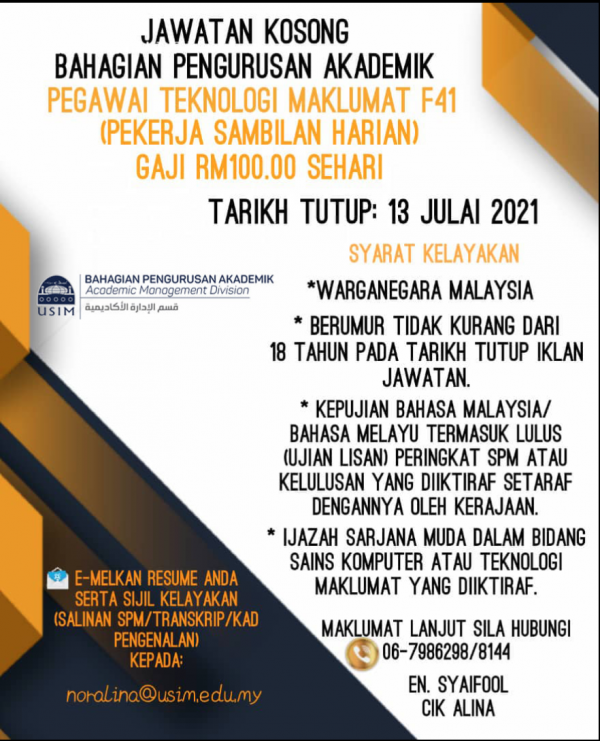 Iklan Jawatan Universiti Sains Islam Malaysia (USIM) Like serta Ikut Facebook Kami, follow Chanel WhatsApp Jawatan Kosong & Telegram Portal SPA9 untuk capaian pantas kekosongan jawatan daripada kami sekarang.