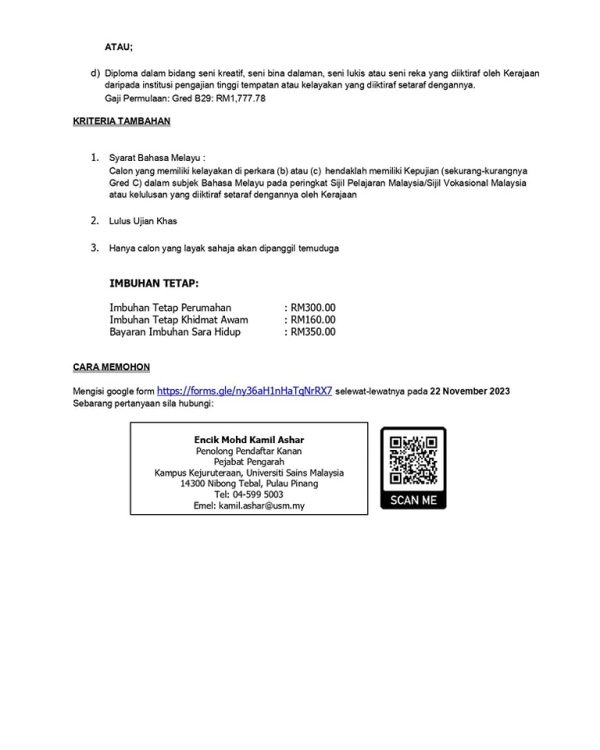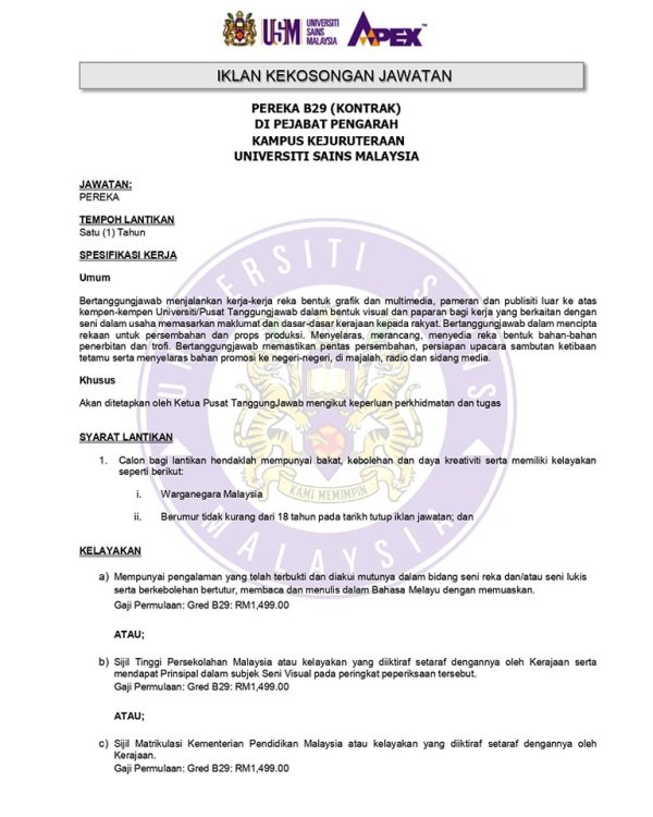 IKlan Jawatan Universiti Sains Malaysia (USM) ~ APEX Like serta Ikut Facebook Kami, follow Chanel WhatsApp Jawatan Kosong & Telegram Portal SPA9 untuk capaian pantas kekosongan jawatan daripada kami sekarang.