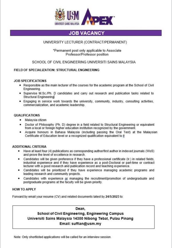 Iklan Jawatan Universiti Sains Malaysia (USM) Like serta Ikut Facebook Kami, follow Chanel WhatsApp Jawatan Kosong & Telegram Portal SPA9 untuk capaian pantas kekosongan jawatan daripada kami sekarang.