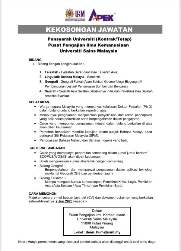 IKlan Jawatan Universiti Sains Malaysia Like serta Ikut Facebook Kami, follow Chanel WhatsApp Jawatan Kosong & Telegram Portal SPA9 untuk capaian pantas kekosongan jawatan daripada kami sekarang.