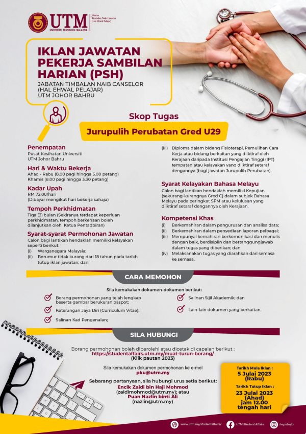 Iklan Jawatan Universiti Teknologi Malaysia (UTM) Like serta Ikut Facebook Kami, follow Chanel WhatsApp Jawatan Kosong & Telegram Portal SPA9 untuk capaian pantas kekosongan jawatan daripada kami sekarang.