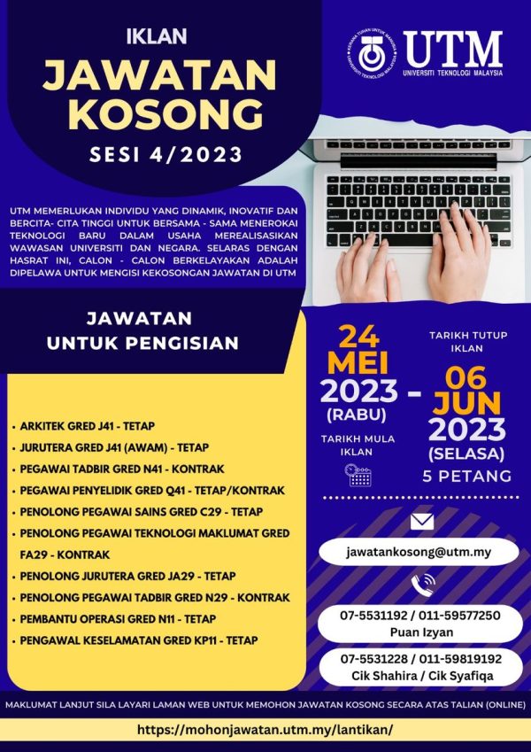 Iklan Jawatan Universiti Teknologi Malaysia (UTM) Like serta Ikut Facebook Kami, follow Chanel WhatsApp Jawatan Kosong & Telegram Portal SPA9 untuk capaian pantas kekosongan jawatan daripada kami sekarang. Klik Jawatan Disini