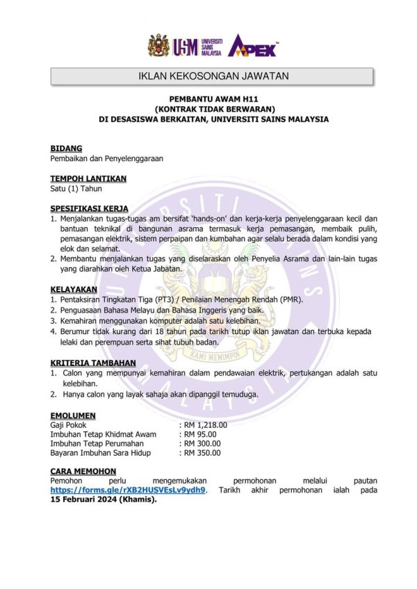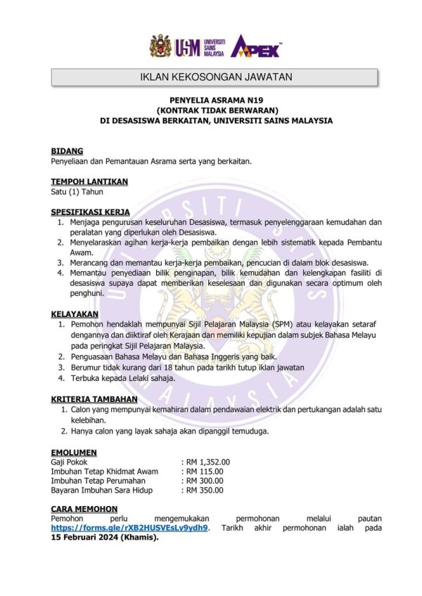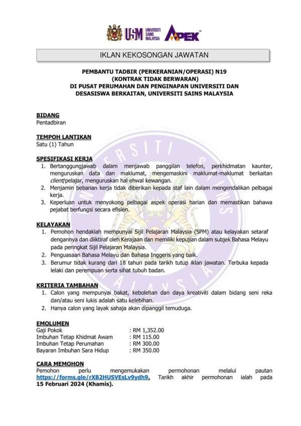Iklan Jawatan USM Like serta Ikut Facebook Kami, follow Chanel WhatsApp Jawatan Kosong & Telegram Portal SPA9 untuk capaian pantas kekosongan jawatan daripada kami sekarang. Klik Jawatan Disini