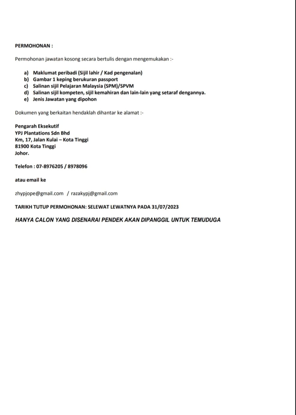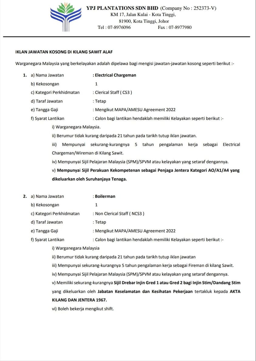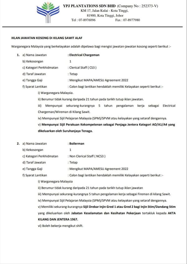 Iklan Jawatan YPJ Plantations Like serta Ikut Facebook Kami, follow Chanel WhatsApp Jawatan Kosong & Telegram Portal SPA9 untuk capaian pantas kekosongan jawatan daripada kami sekarang.