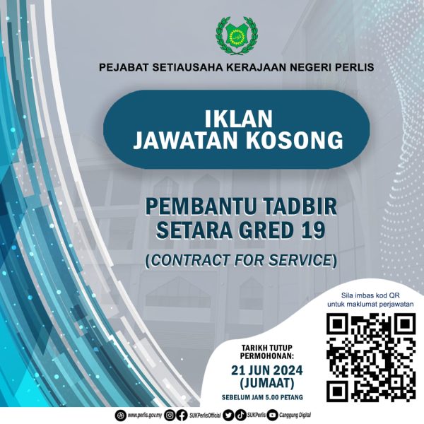 | Pembantu Tadbir Setara Gred 19 (Contract For Service) | Melaksanakan tugas-tugas pentadbiran dan pengurusan | Mengimbas Kod QR di poster iklan | 21 Jun 2024 (Jumaat) sebelum jam 5.00 petang |