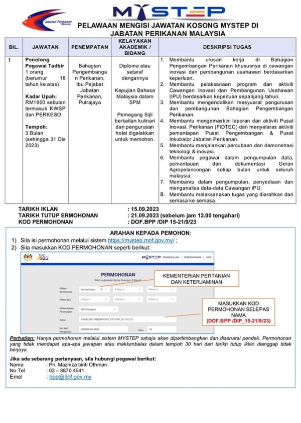 Iklan Jawtaan Terkini Jabatan Perikanan Malaysia (DOF) Like serta Ikut Facebook Kami, follow Chanel WhatsApp Jawatan Kosong & Telegram Portal SPA9 untuk capaian pantas kekosongan jawatan daripada kami sekarang.