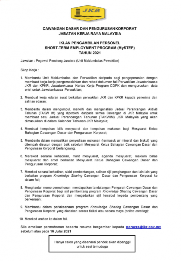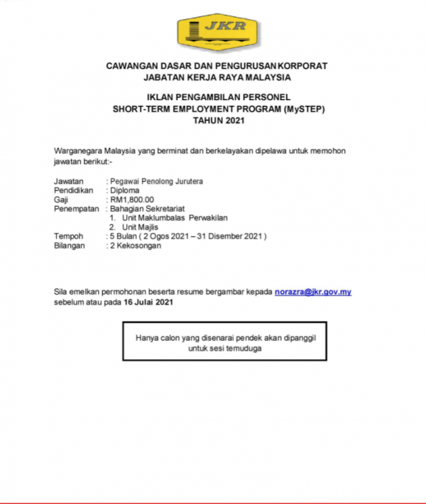 Iklan Jawatan Jabatan Kerja Raya (JKR) Like serta Ikut Facebook Kami, follow Chanel WhatsApp Jawatan Kosong & Telegram Portal SPA9 untuk capaian pantas kekosongan jawatan daripada kami sekarang.