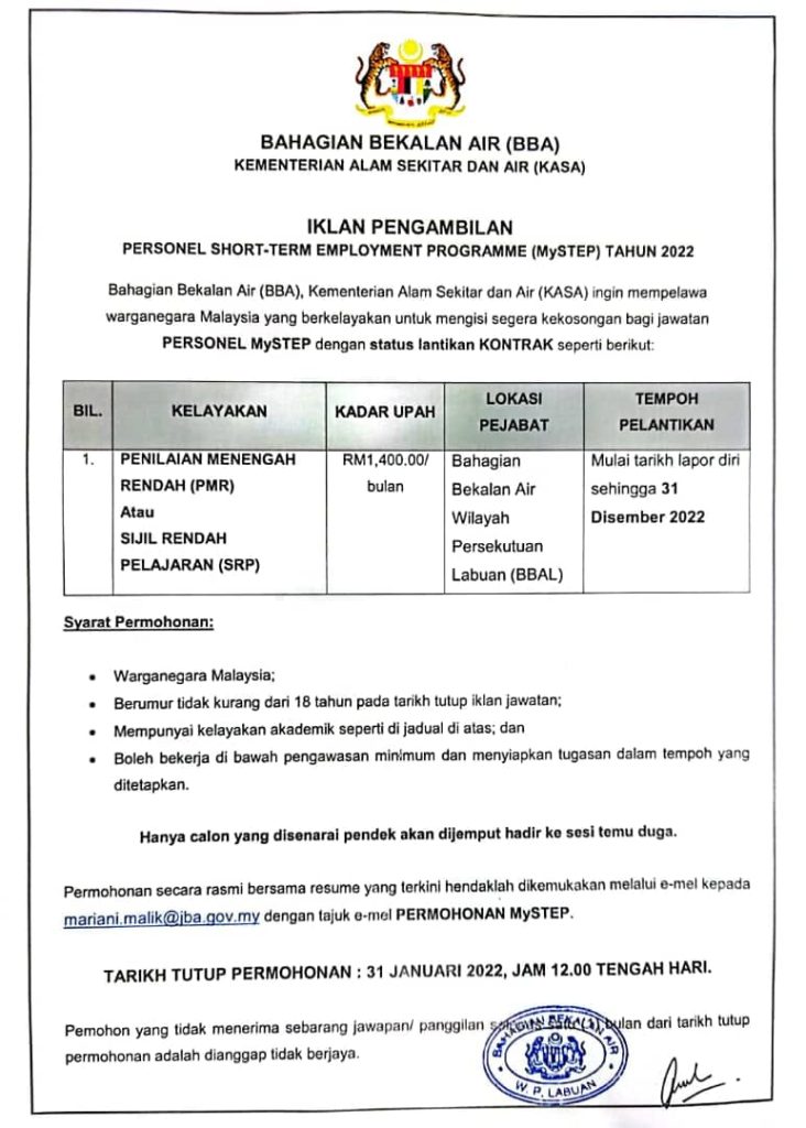 Iklan Jawatan Kementerian Alam Sekitar Dan Air Like serta Ikut Facebook Kami, follow Chanel WhatsApp Jawatan Kosong & Telegram Portal SPA9 untuk capaian pantas kekosongan jawatan daripada kami sekarang.