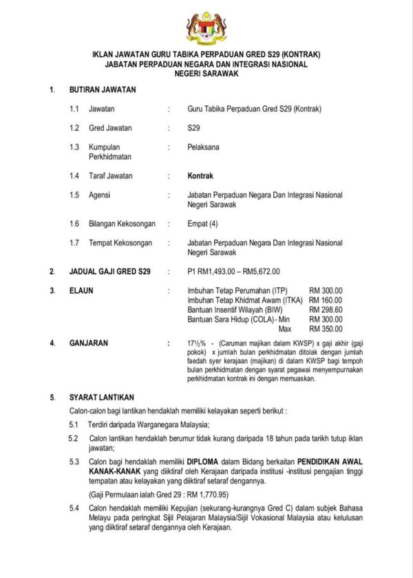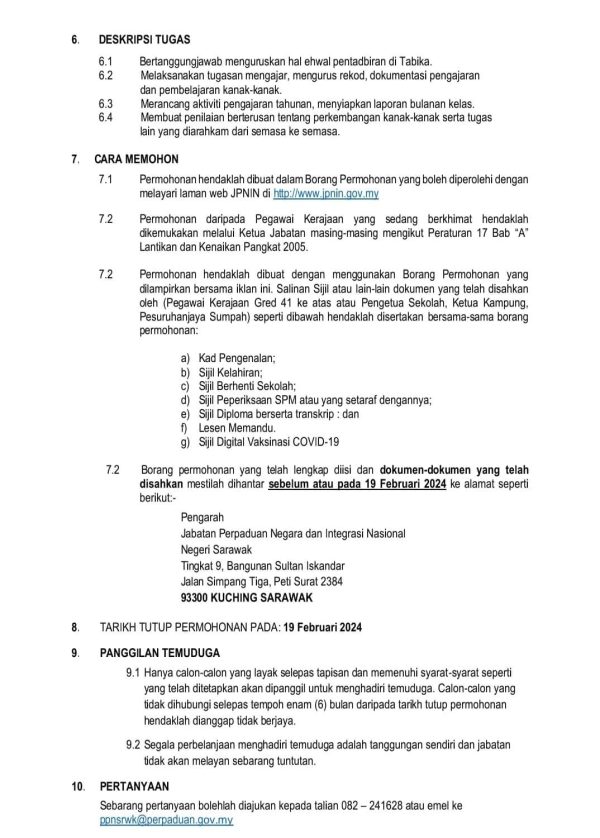 Iklan Kekosongan Jawatan Guru Tabika Perpaduan Di Jabatan Perpaduan Negara Dan Integrasi Nasional (JPNIN)