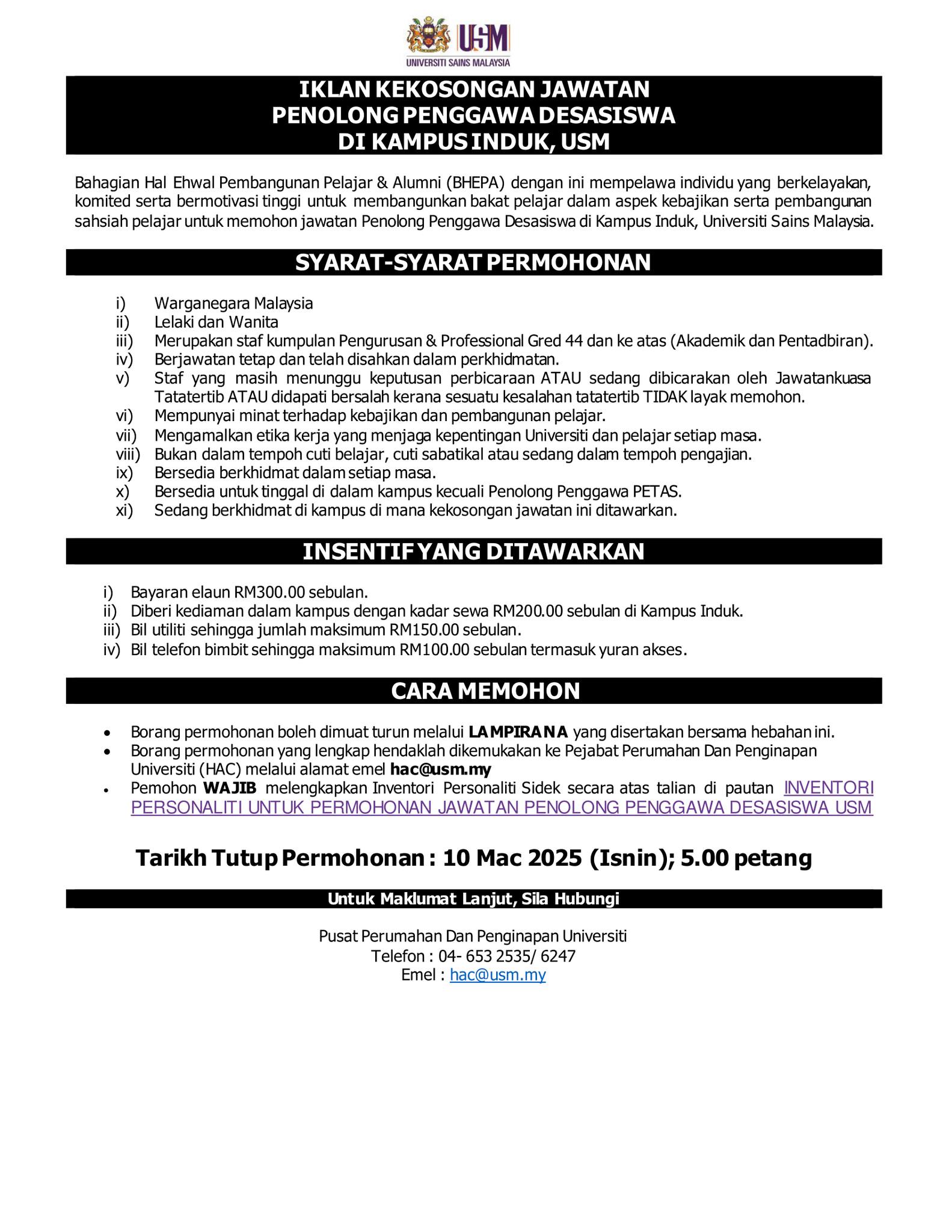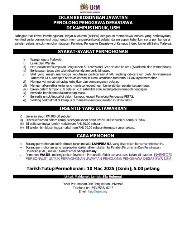 Iklan Kekosongan Jawatan Penolong Penggawa Desasiswa Di Kampus Induk, Universiti Sains Malaysia