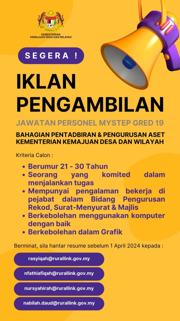 Iklan Kementerian Kemajuan Desa Dan Wilayah Like serta Ikut Facebook Kami, follow Chanel WhatsApp Jawatan Kosong & Telegram Portal SPA9 untuk capaian pantas kekosongan jawatan daripada kami sekarang.