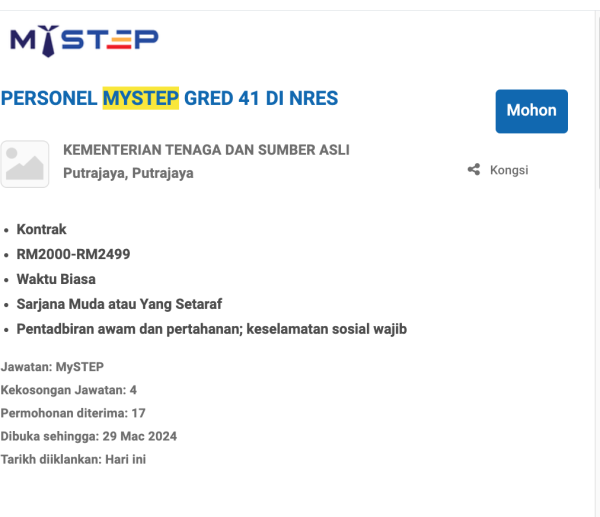 Permohonan jawatan ini boleh dibuat melalui Portal MyFutureJobs. Sila ke Portal MyFutureJobs dan Masukkan Kata Carian yang ingin dicari “KEMENTERIAN TENAGA DAN SUMBER ASLI” di bahagian carian untuk memohon jawatan yang diiklankan.