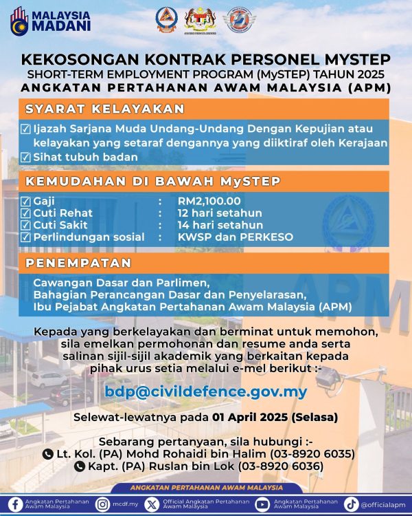 Iklan Kini Angkatan Pertahanan Awam Malaysia Like serta Ikut Facebook Kami, follow Chanel WhatsApp Jawatan Kosong & Telegram Portal SPA9 untuk capaian pantas kekosongan jawatan daripada kami sekarang. Klik Jawatan Disini