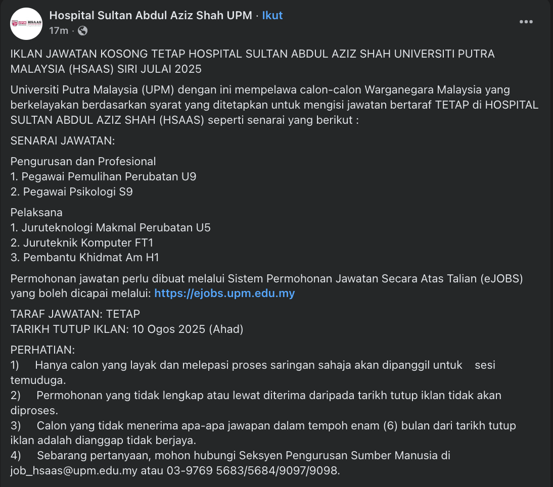 Iklan Kini Hospital Sultan Abdul Aziz Shah (HSAAS) Like serta Ikut Facebook Kami, follow Chanel WhatsApp Jawatan Kosong & Telegram Portal SPA9 untuk capaian pantas kekosongan jawatan daripada kami sekarang. Klik Jawatan Disini