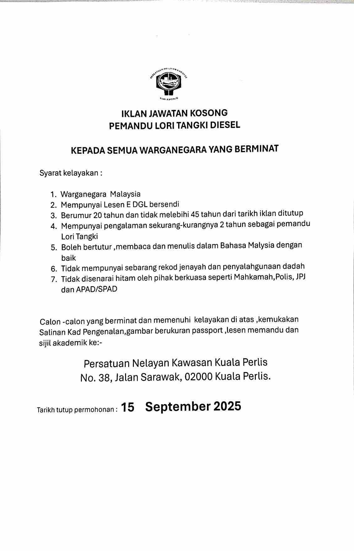 Iklan KIni Iklan Jawatan Kosong Persatuan Nelayan Kawasan Kuala Perlis โ Pemandu Lori Tangki Diesel ๐