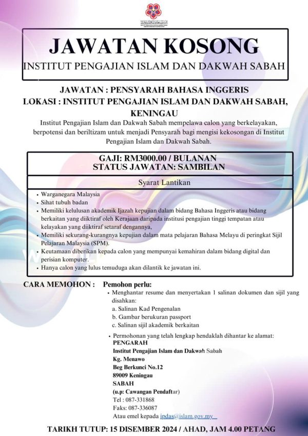 IKlan Kini Institut Pengajian Islam Dan Dakwah Sabah – IPDAS Like serta Ikut Facebook Kami, follow Chanel WhatsApp Jawatan Kosong & Telegram Portal SPA9 untuk capaian pantas kekosongan jawatan daripada kami sekarang. Klik Iklan Jawatan