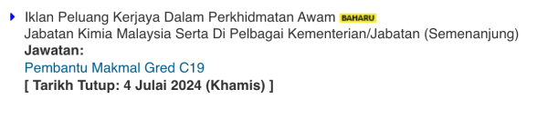 Iklan Kini Jabatan Kimia Malaysia Serta Di Pelbagai Kementerian/Jabatan Like serta Ikut Facebook Kami, follow Chanel WhatsApp Jawatan Kosong & Telegram Portal SPA9 untuk capaian pantas kekosongan jawatan daripada kami sekarang. Klik Jawatan Disini