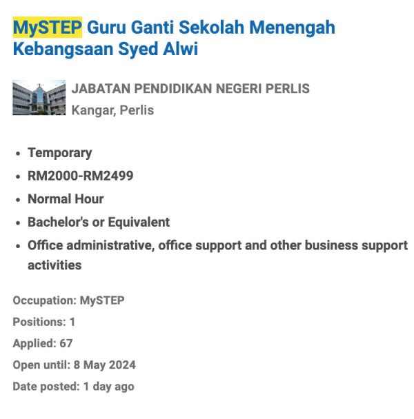Permohonan jawatan ini boleh dibuat melalui Portal MyFutureJobs. Sila ke Portal MyFutureJobs dan Masukkan Kata Carian yang ingin dicari “JABATAN PENDIDIKAN NEGERI PERLIS” di bahagian carian untuk memohon jawatan yang diiklankan.