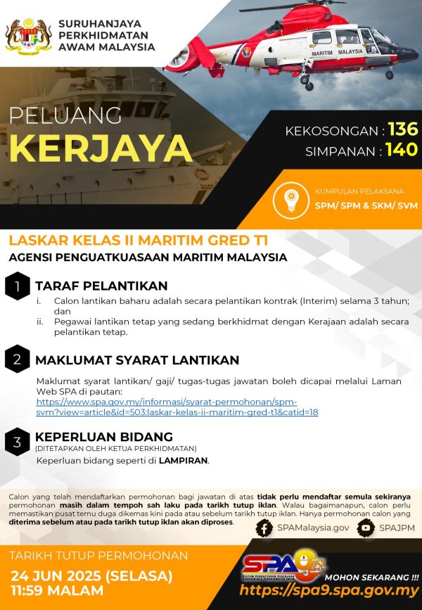 Iklan Kini Jawatan Agensi Penguatkuasaan Maritim Malaysia Klik Jawatan Disini Like serta Ikut Facebook Kami, follow Chanel WhatsApp Jawatan Kosong & Telegram Portal SPA9 untuk capaian pantas kekosongan jawatan daripada kami sekarang.