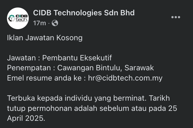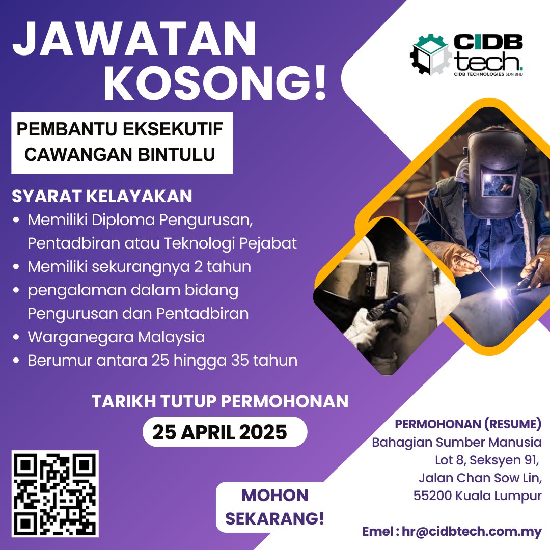 Iklan Kini Jawatan CIDB Technologies Sdn Bhd Klik Jawatan Disini Like serta Ikut Facebook Kami, follow Chanel WhatsApp Jawatan Kosong & Telegram Portal SPA9 untuk capaian pantas kekosongan jawatan daripada kami sekarang.