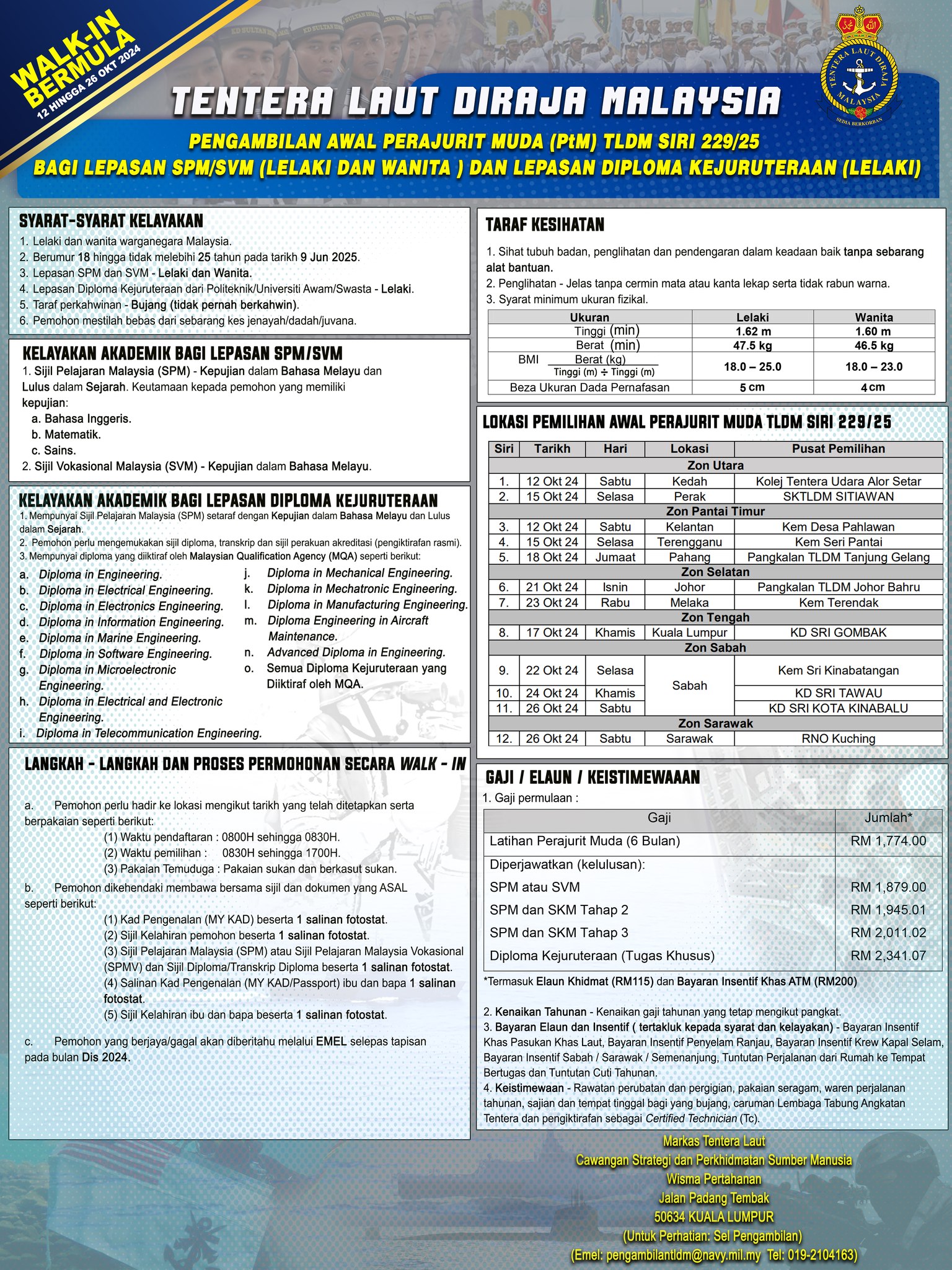 Iklan Kini Jawatan Di Tentera Laut Diraja Malaysia Like serta Ikut Facebook Kami, follow Chanel WhatsApp Jawatan Kosong & Telegram Portal SPA9 untuk capaian pantas kekosongan jawatan daripada kami sekarang. Klik Jawatan Disini