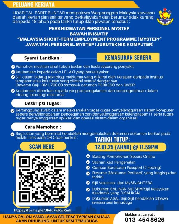 Iklan Kini Jawatan Hospital Parit Buntar Klik Iklan Jawatan Like serta Ikut Facebook Kami, follow Chanel WhatsApp Jawatan Kosong & Telegram Portal SPA9 untuk capaian pantas kekosongan jawatan daripada kami sekarang.