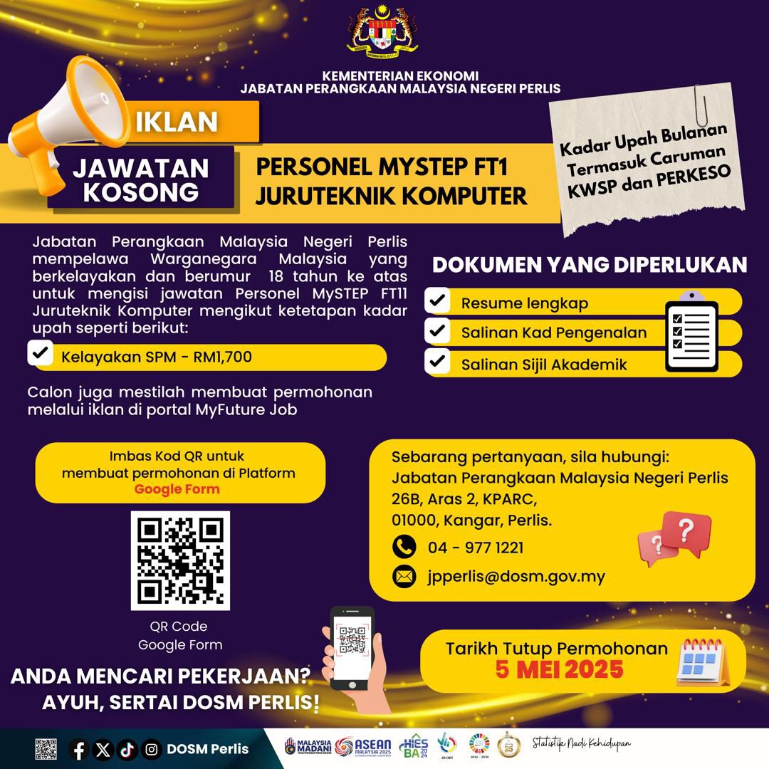 Iklan Kini Jawatan Jabatan Perangkaan Perlis Klik Jawatan Disini Like serta Ikut Facebook Kami, follow Chanel WhatsApp Jawatan Kosong & Telegram Portal SPA9 untuk capaian pantas kekosongan jawatan daripada kami sekarang.