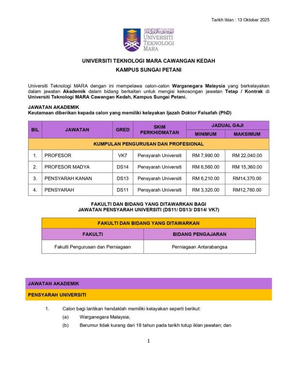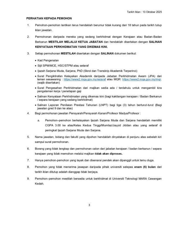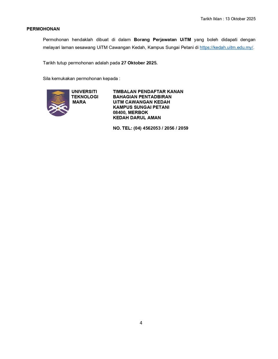 Iklan Kini Jawatan Jawatan Kosong Terkini Universiti Teknologi Mara (UiTM) Cawangan Kedah Like serta Ikut Facebook Kami, follow Chanel WhatsApp Jawatan Kosong & Telegram Portal SPA9 untuk capaian pantas kekosongan jawatan daripada kami sekarang. Klik Iklan Jawatan