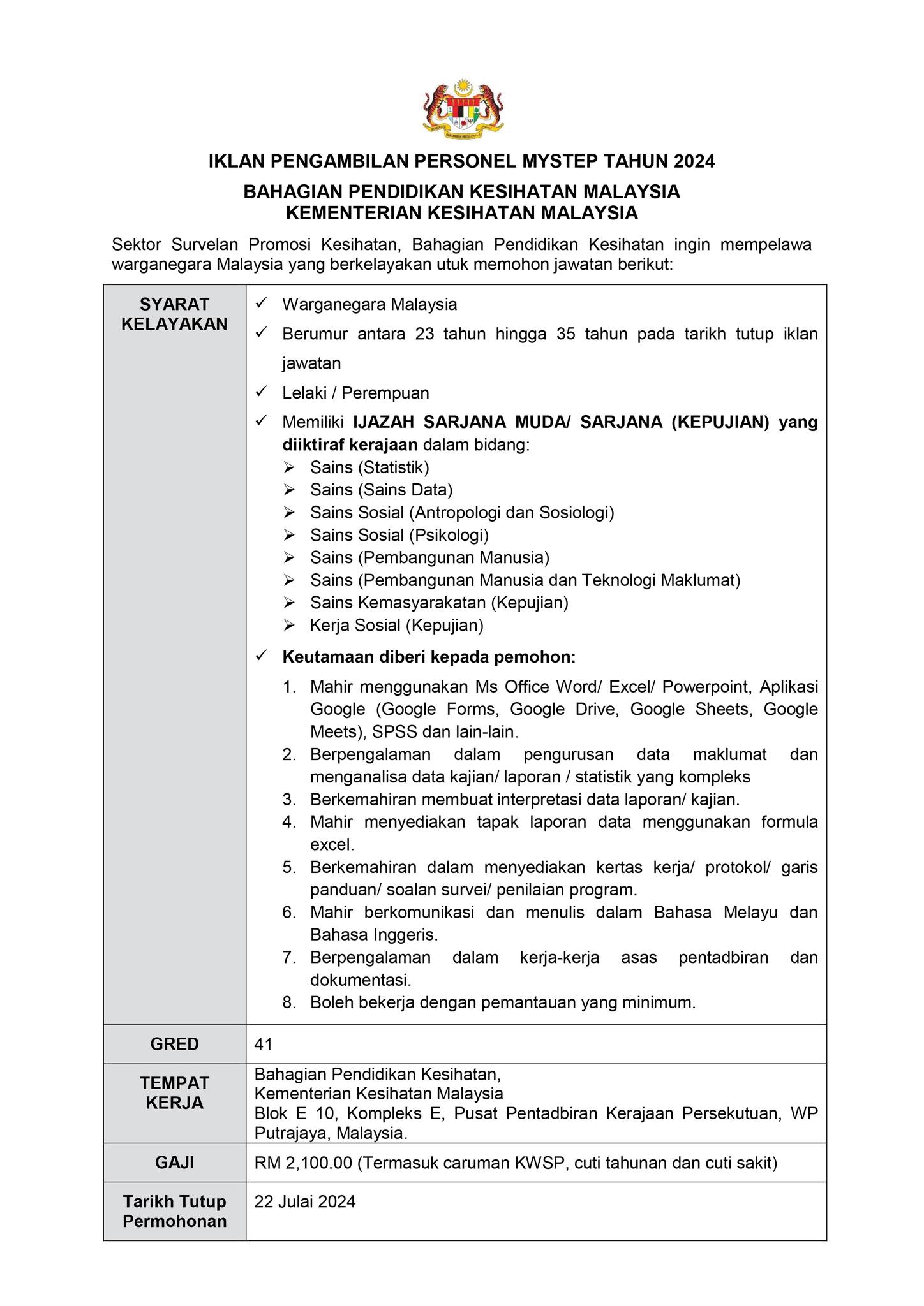Iklan Kini Jawatan Kementerian Kesihatan Malaysia (KKM) Klik Jawatan Disini Like serta Ikut Facebook Kami, follow Chanel WhatsApp Jawatan Kosong & Telegram Portal SPA9 untuk capaian pantas kekosongan jawatan daripada kami sekarang.