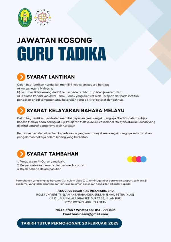 Iklan Kini Jawatan KIAS Insani Like serta Ikut Facebook Kami, follow Chanel WhatsApp Jawatan Kosong & Telegram Portal SPA9 untuk capaian pantas kekosongan jawatan daripada kami sekarang. Klik Iklan Jawatan