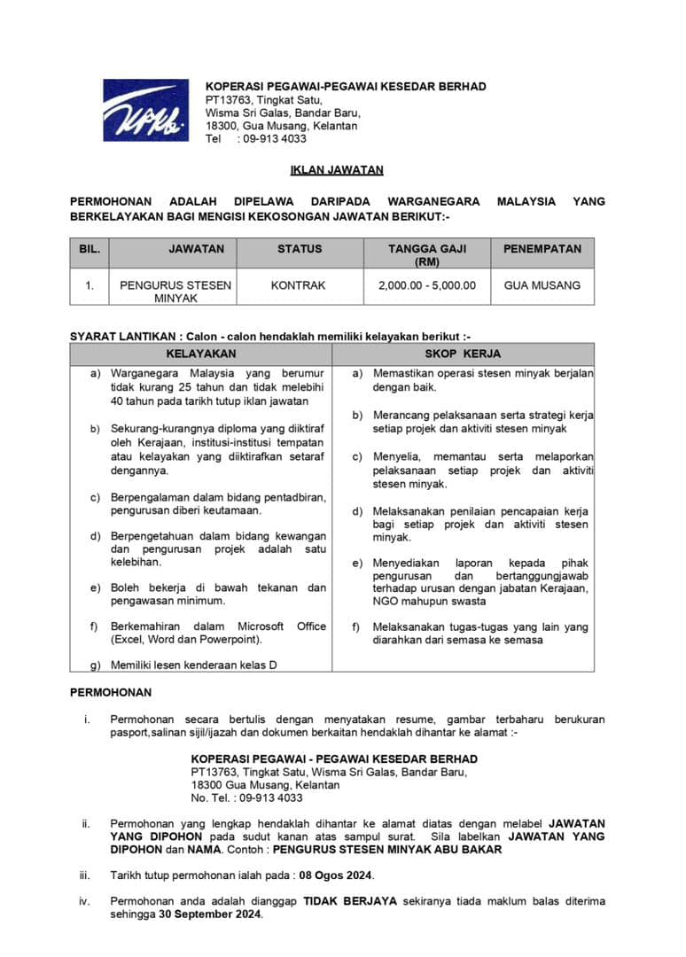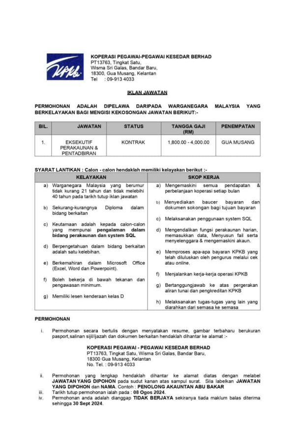 Iklan Kini Jawatan Koperasi Pegawai-Pegawai Kesedar Berhad Klik Jawatan Disini Like serta Ikut Facebook Kami, follow Chanel WhatsApp Jawatan Kosong & Telegram Portal SPA9 untuk capaian pantas kekosongan jawatan daripada kami sekarang.