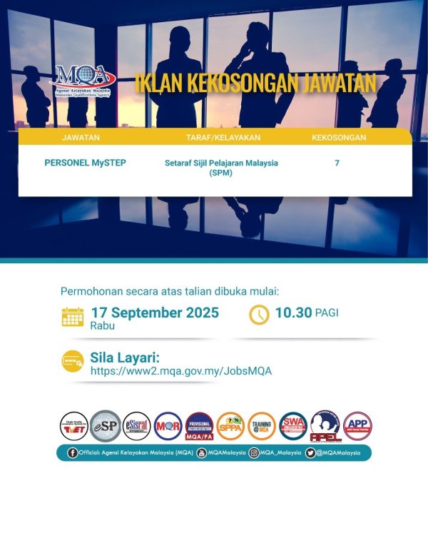 Iklan Kini Jawatan Kosong Agensi Kelayakan Malaysia (MQA) Like serta Ikut Facebook Kami, follow Chanel WhatsApp Jawatan Kosong & Telegram Portal SPA9 untuk capaian pantas kekosongan jawatan daripada kami sekarang. Klik Iklan Disini