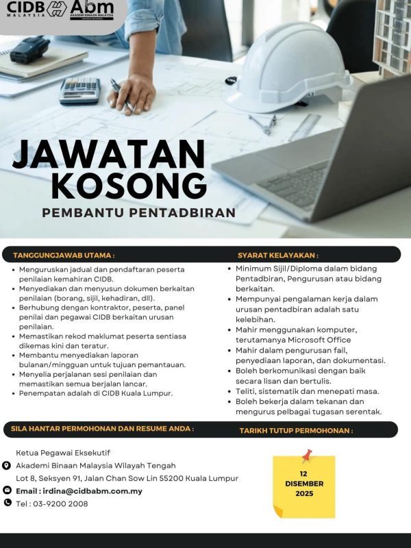 Iklan Kini Jawatan Kosong Akademi Binaan Malaysia (ABM) Like serta Ikut Facebook Kami, follow Chanel WhatsApp Jawatan Kosong & Telegram Portal SPA9 untuk capaian pantas kekosongan jawatan daripada kami sekarang.
