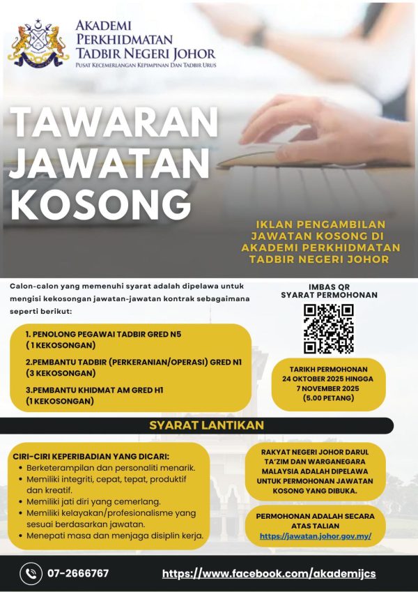 Iklan Kini Jawatan Kosong Akademi Perkhidmatan Tadbir Negeri Johor Like serta Ikut Facebook Kami, follow Chanel WhatsApp Jawatan Kosong & Telegram Portal SPA9 untuk capaian pantas kekosongan jawatan daripada kami sekarang. Klik Iklan Jawatan