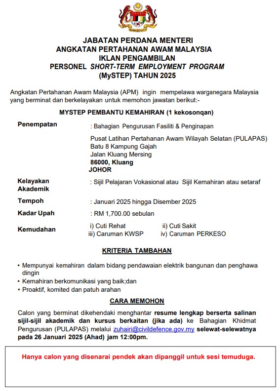 Iklan Kini Jawatan Kosong Angkatan Pertahanan Awam (APM) Like serta Ikut Facebook Kami, follow Chanel WhatsApp Jawatan Kosong & Telegram Portal SPA9 untuk capaian pantas kekosongan jawatan daripada kami sekarang. Klik Iklan Jawatan