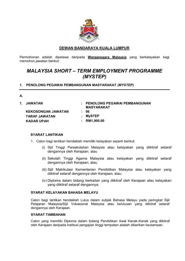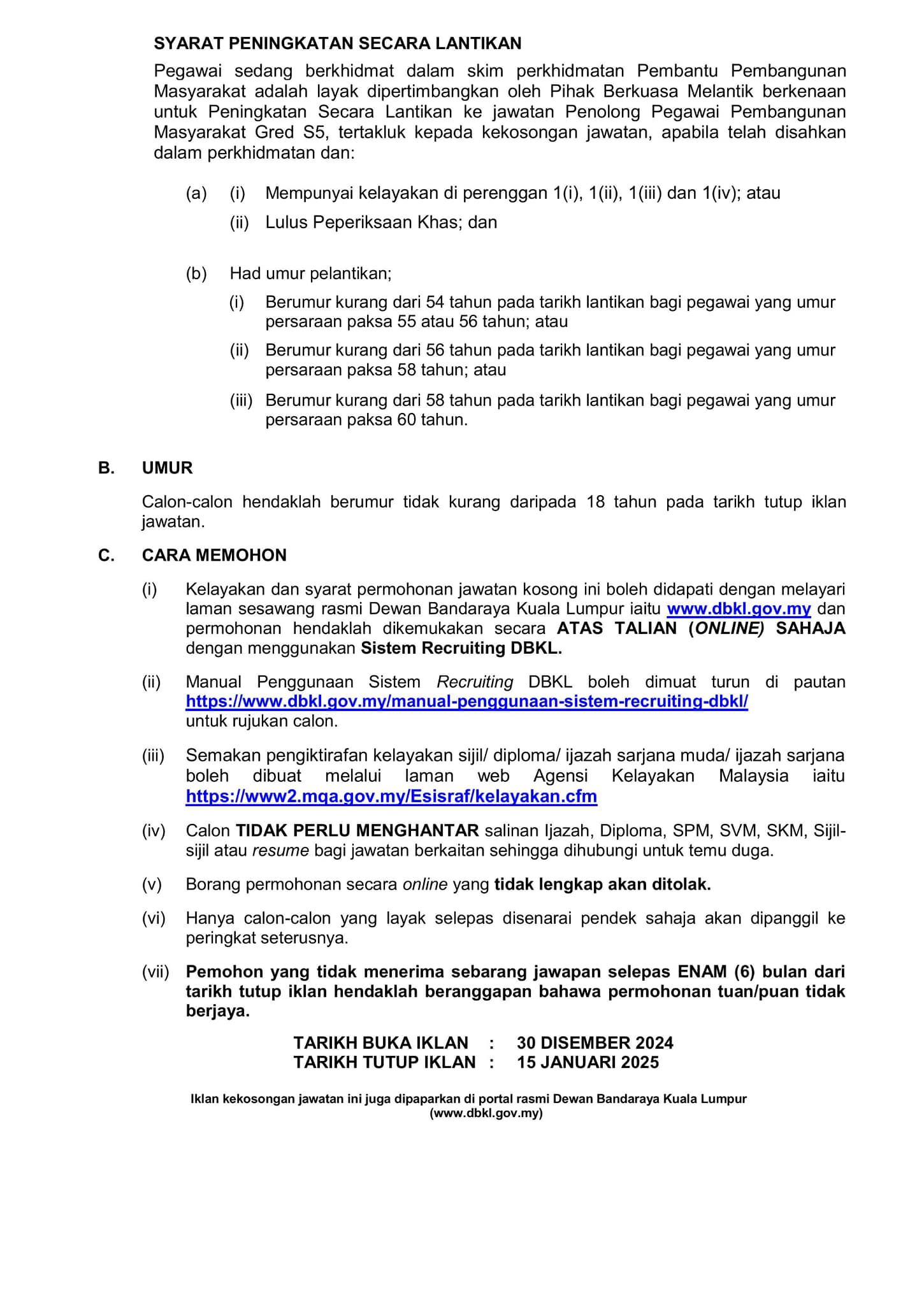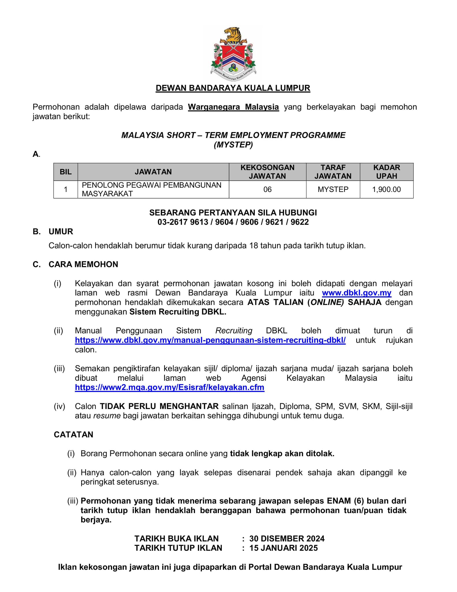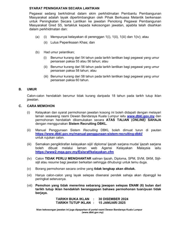 Iklan Kini Jawatan Kosong Dewan Bandaraya Kuala Lumpur (DBKL) Klik Iklan Jawatan Like serta Ikut Facebook Kami, follow Chanel WhatsApp Jawatan Kosong & Telegram Portal SPA9 untuk capaian pantas kekosongan jawatan daripada kami sekarang.