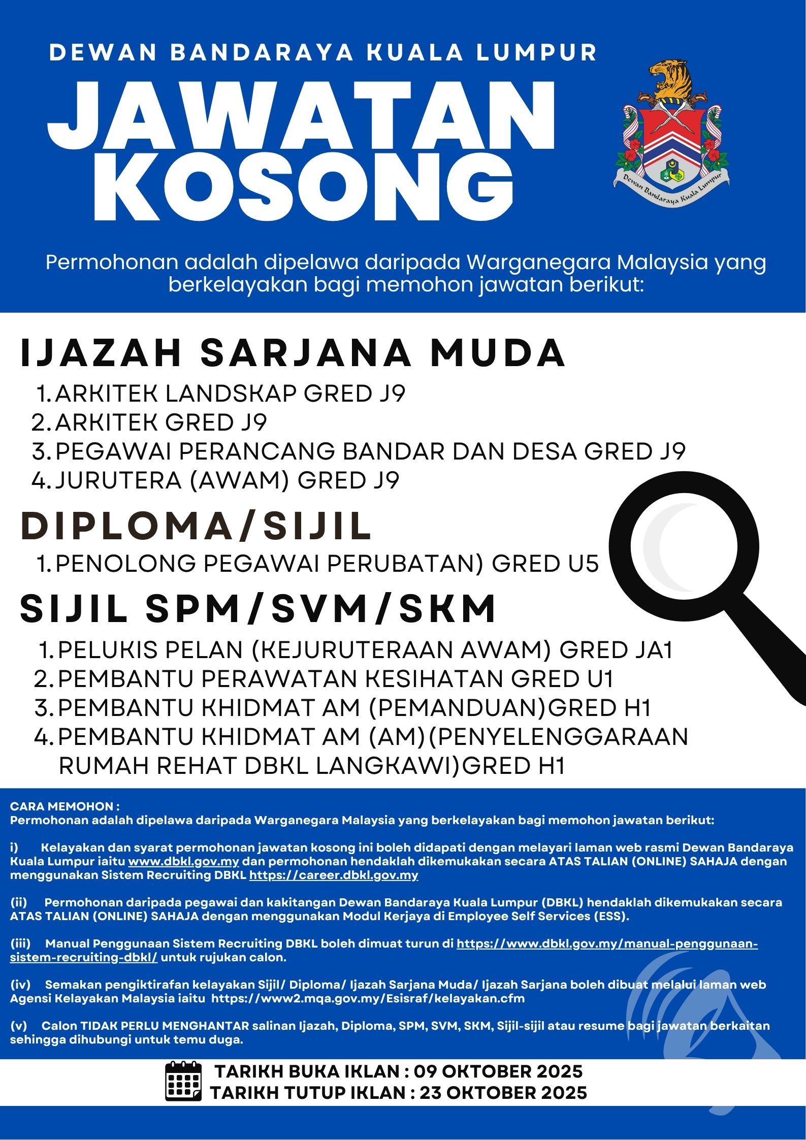 Iklan Kini Jawatan Kosong Dewan Bandaraya Kuala Lumpur (DBKL) Like serta Ikut Facebook Kami, follow Chanel WhatsApp Jawatan Kosong & Telegram Portal SPA9 untuk capaian pantas kekosongan jawatan daripada kami sekarang. Klik Iklan Jawatan