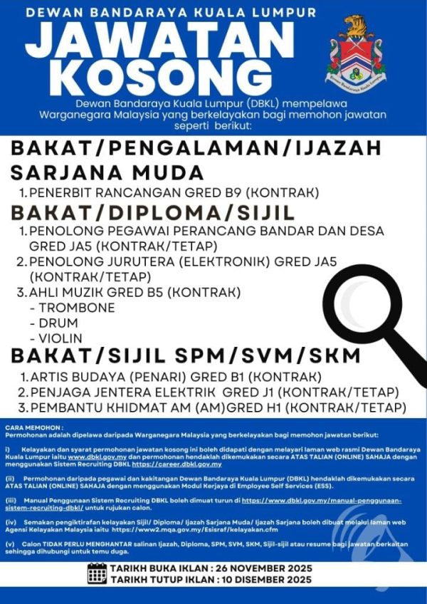 Iklan Kini Jawatan Kosong Dewan Bandaraya Kuala Lumpur (DBKL) Like serta Ikut Facebook Kami, follow Chanel WhatsApp Jawatan Kosong & Telegram Portal SPA9 untuk capaian pantas kekosongan jawatan daripada kami sekarang. Klik Iklan Disini