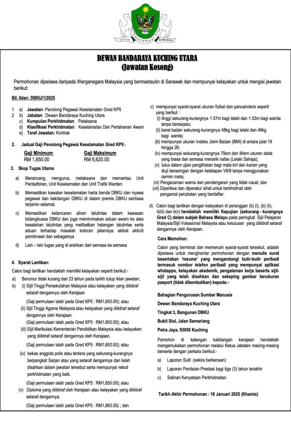 Iklan Kini Jawatan Kosong Dewan Bandaraya Kuching Utara (DBKU) Klik Iklan Jawatan Like serta Ikut Facebook Kami, follow Chanel WhatsApp Jawatan Kosong & Telegram Portal SPA9 untuk capaian pantas kekosongan jawatan daripada kami sekarang.