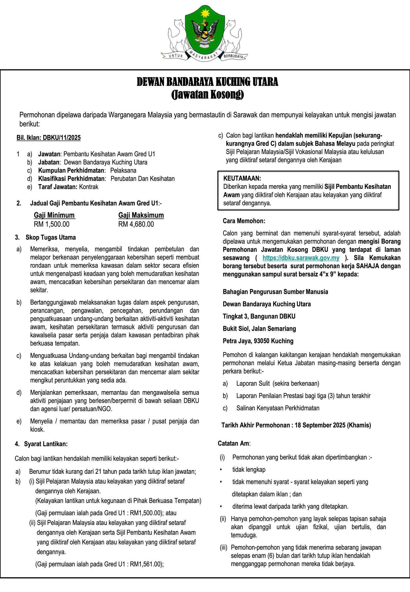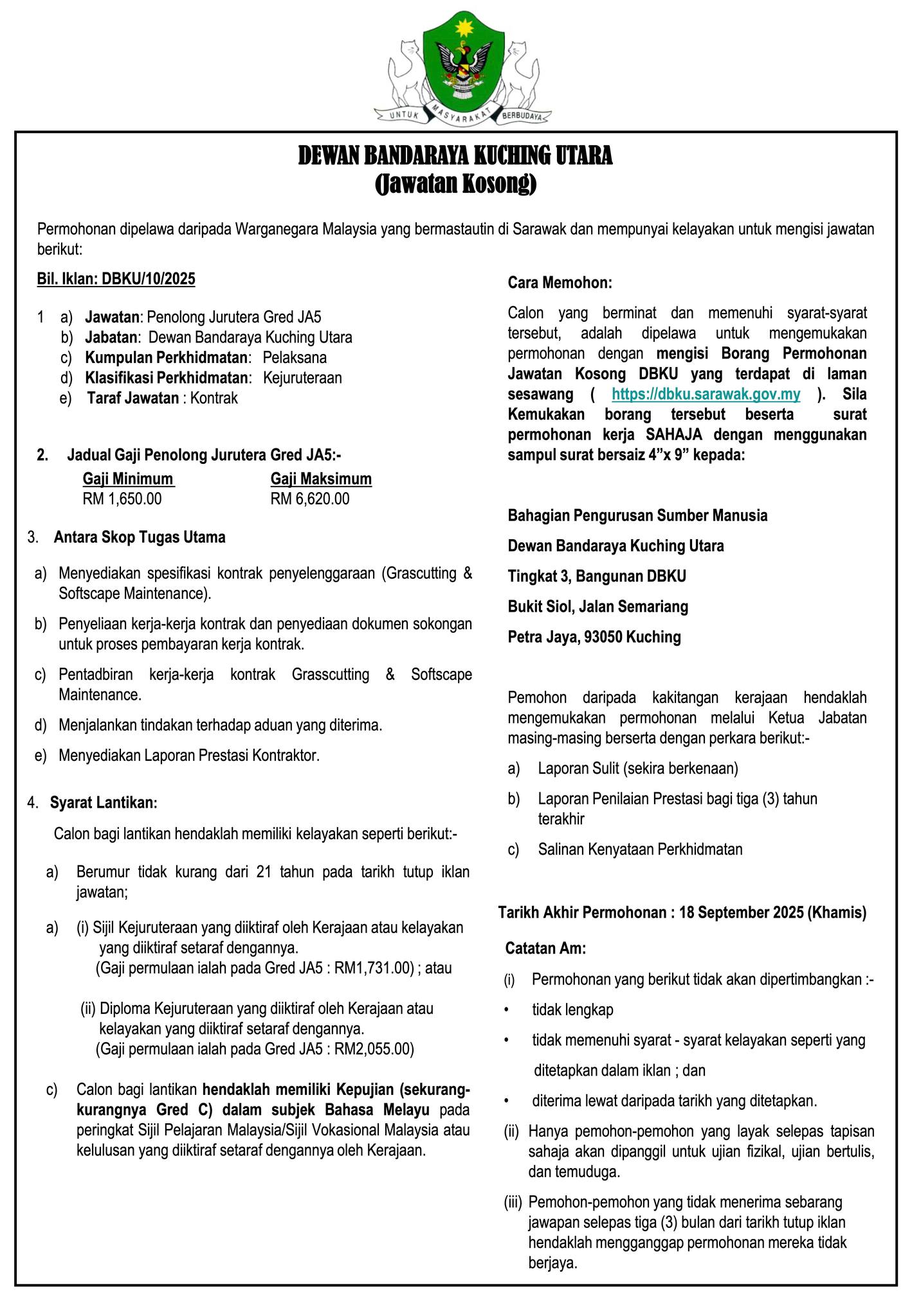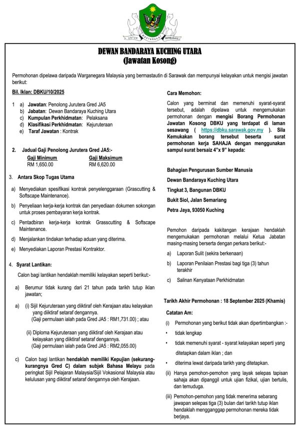 Iklan Kini Jawatan Kosong Dewan Bandaraya Kuching Utara (DBKU) Like serta Ikut Facebook Kami, follow Chanel WhatsApp Jawatan Kosong & Telegram Portal SPA9 untuk capaian pantas kekosongan jawatan daripada kami sekarang. Klik Iklan Disini