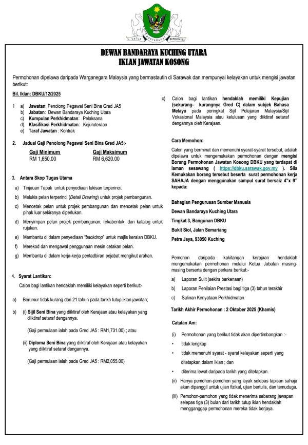 Iklan Kini Jawatan Kosong Dewan Bandaraya Kuching Utara (DBKU) Klik Iklan Jawatan Like serta Ikut Facebook Kami, follow Chanel WhatsApp Jawatan Kosong & Telegram Portal SPA9 untuk capaian pantas kekosongan jawatan daripada kami sekarang.