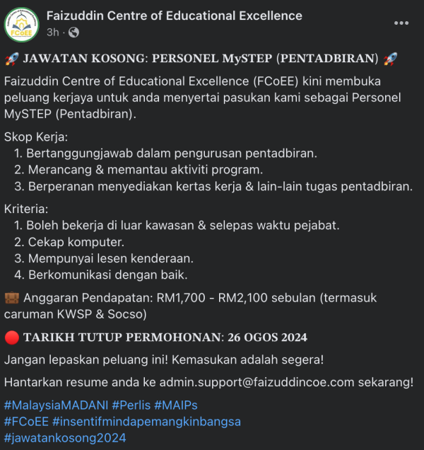 Iklan Kini Jawatan Kosong Di Faizuddin Centre of Educational Excellence (FCoEE) Like serta Ikut Facebook Kami, follow Chanel WhatsApp Jawatan Kosong & Telegram Portal SPA9 untuk capaian pantas kekosongan jawatan daripada kami sekarang. Klik Jawatan Disini