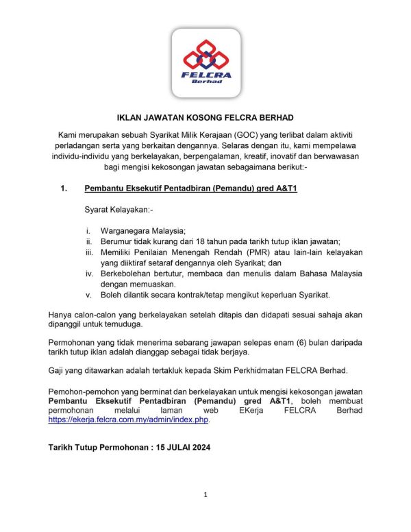 Iklan Kini Jawatan Kosong FELCRA Berhad Like serta Ikut Facebook Kami, follow Chanel WhatsApp Jawatan Kosong & Telegram Portal SPA9 untuk capaian pantas kekosongan jawatan daripada kami sekarang. Klik Jawatan Disini